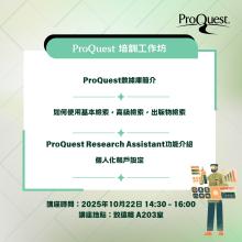 Date & Time Wednesday, 22 October 2025, 14:30 - 16:00 Location Room A203, Chi Un Building Content Overview of ProQuest Database How to use Basic Search, Advanced Search, and Publication Search ProQuest Research Assistant & Account Setup Medium of Instruction... more